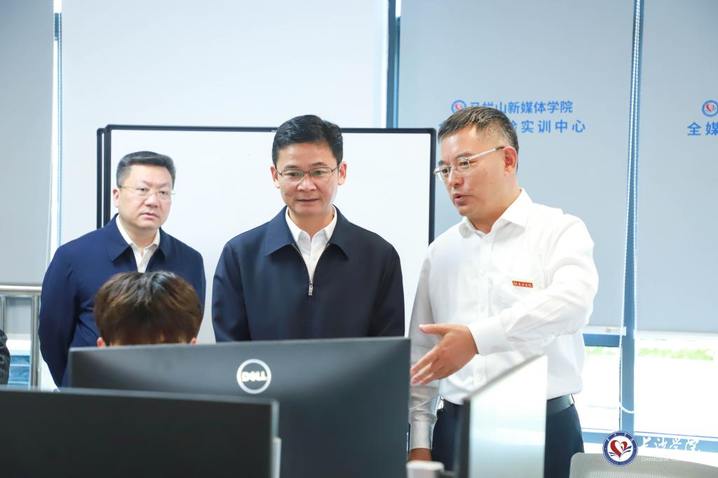 曹志强来到我校马栏山新媒体学院,实地察看了学院全媒体实验实训中心、短视频工厂等,详细了解了学校文化科技融合专业设置与人才培养等情况。校长陈赤平,党委委员、副校长、马栏山新媒体学院院长张世英陪同。