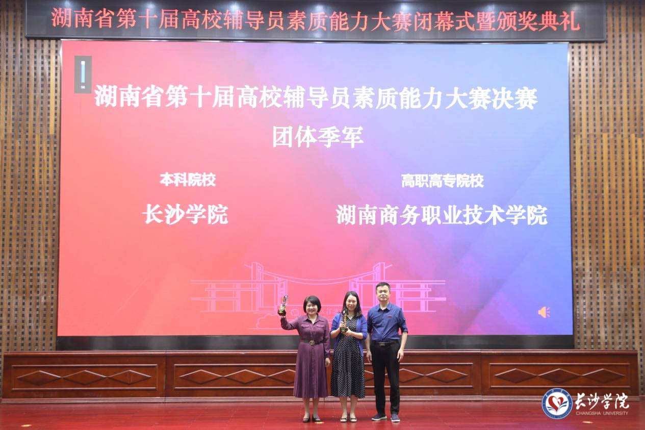 湖南省高校辅导员素质能力大赛每两年举办一次,分为初赛、复赛和决赛三个阶段。今年,经过校内初赛选拔,我校参赛队由土木工程学院辅导员邱慧、计算机科学与工程学院辅导员王欣怡、马栏山新媒体学院辅导员王雯敏三位老师组成。经过与全省百余所高校的辅导员激烈角逐,我校先后取得了全省复赛团体第四、决赛总分第三的好成绩。