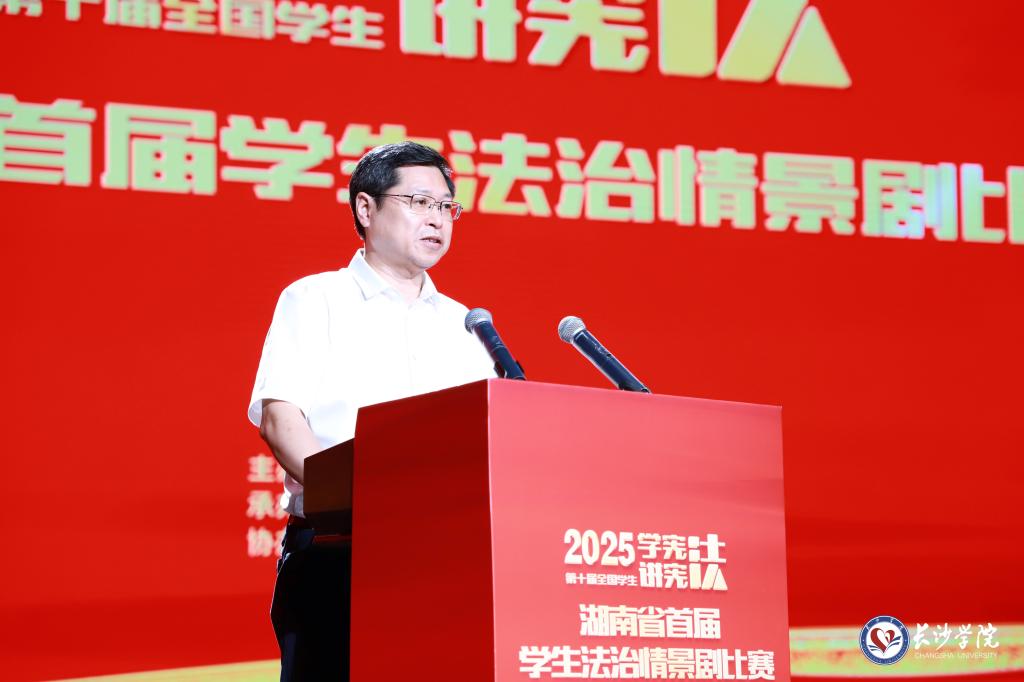 7月10日,由省教育厅主办、省教育科学研究院承办的湖南省首届学生“学宪法 讲宪法”法治情景剧比赛省级现场赛在我校学生活动中心精彩上演。省委教育工委委员,省教育厅总督学黄智勇出席活动并讲话,我校党委委员、纪委书记丁文以及省教育厅政策法规处、省教育科学研究院等有关负责同志参加活动。