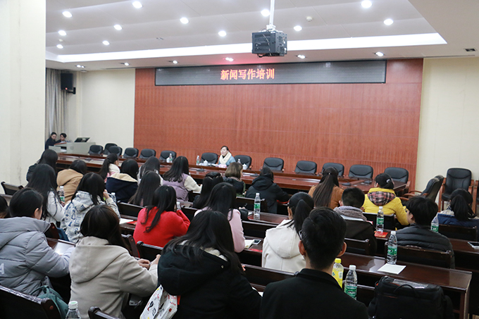11月29日晚,党委宣传部在图书馆一楼会议室召开新闻写作培训讲座。长沙晚报教育工作室主任徐媛受邀主讲,党委宣传部部长谷建春、副部长肖燕芳参加讲座。校报记者团全体学生记者到场聆听学习。