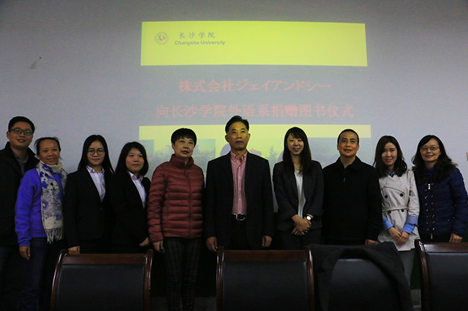 11月8日上午,日本ジェイアンドシー 株式会社向外语系捐赠图书。仪式在宁静楼9楼会议室举行。长沙学院副院长刘世昌,外语系主任雷志敏、系党总支书记王应德、系副主任黄琴、系党总支副书记王艾红,企业负责人石田、高级助理郑翠梅以及2013级外语系30名学生参加了赠书仪式。