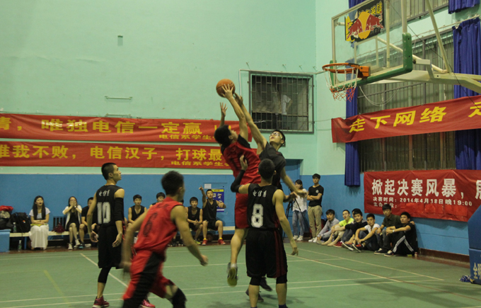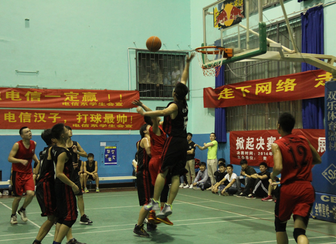 "挑战地心引力,引爆篮球魅力"。4月18日晚,第十四届篮球联赛决赛在永康体育馆火热开赛。经过小组赛和半决赛,电信系和土木系两支队伍脱颖而出,为争夺冠军展开了大对决。