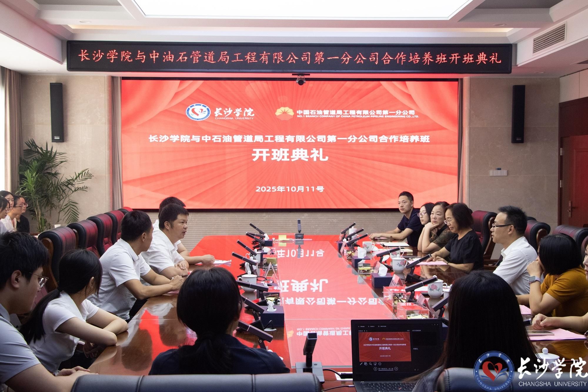 10月11日上午,长沙学院与中石油管道局工程有限公司第一分公司(以下简称“中石油管道局一公司”)产教融合培养班开班典礼在长盛楼4001会议室举行。中石油管道局一公司党委委员、副经理陈梦圆、郭建良等出席典礼。校党委委员、副校长何利华出席并致辞。招生与就业指导处、相关二级学院主要负责人和学生代表参加典礼。