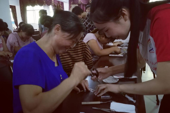7月17日,团队成员开展了系列帮扶活动。在大安乡大红村村委会会议室为当地贫困村民进行景泰蓝工艺画培训。深入大红村贫困户家里进行慰问,了解当地村民的贫困程度、留守劳动力、经济状况。到大安乡中心小学,为留守儿童开展景泰蓝工艺画传习课程培训,让孩子们在课堂上体验传统文化的艺术魅力。
