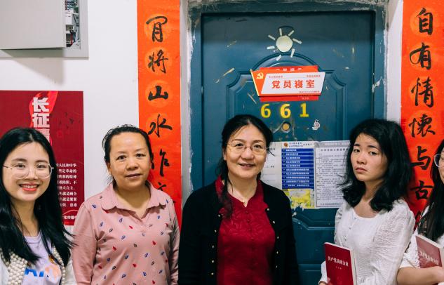 661寝室共发展有王怡、苏晓彤、伍伊琳三名党员,胡嫔教授首先表达了对该寝室卫生工作和成员精神风貌的肯定。她希望以661宿舍为标杆寝室,以点带面,形成星星之火、燎原之势,拓展学生党建和思想政治教育工作的辐射范围。同时,告诫同学们努力学习专业知识,积极参加学科竞赛,提高专业能力,努力成为又红又专的中国特色社会主义接班人。随后,由胡嫔教授、王艾红副书记为661寝室进行赠书仪式,并挂牌“党员寝室”称号。