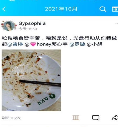 11日至30日,校权益部在勤思广场摆点发放食品安全知识宣传折页,并现场开展“食品安全我先行”签名活动。在校学生会官方qq线上宣传并开展“光盘接力”打卡活动,引导同学们在社交平台发布自己的“光盘”照并附上相关语句,宣传光盘理念,营造良好氛围。同学们踊跃参与,活动反馈好评如潮。