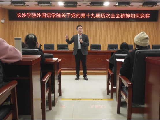 2021年11月23日下午,外国语学院党总支在新图书馆学术报告厅举办了关于党的十九届历次全会精神知识竞答活动。竞答内容以党的十九届六中全会精神为主,参与者主要是外国语学院学生党员、发展对象以及入党积极分子。外国语学院党总支副书记姚金安、学生一支部书记刘桢、学生二支部书记陈茂、负责学生党务工作的辅导员老师刘晗参加了本次活动。
