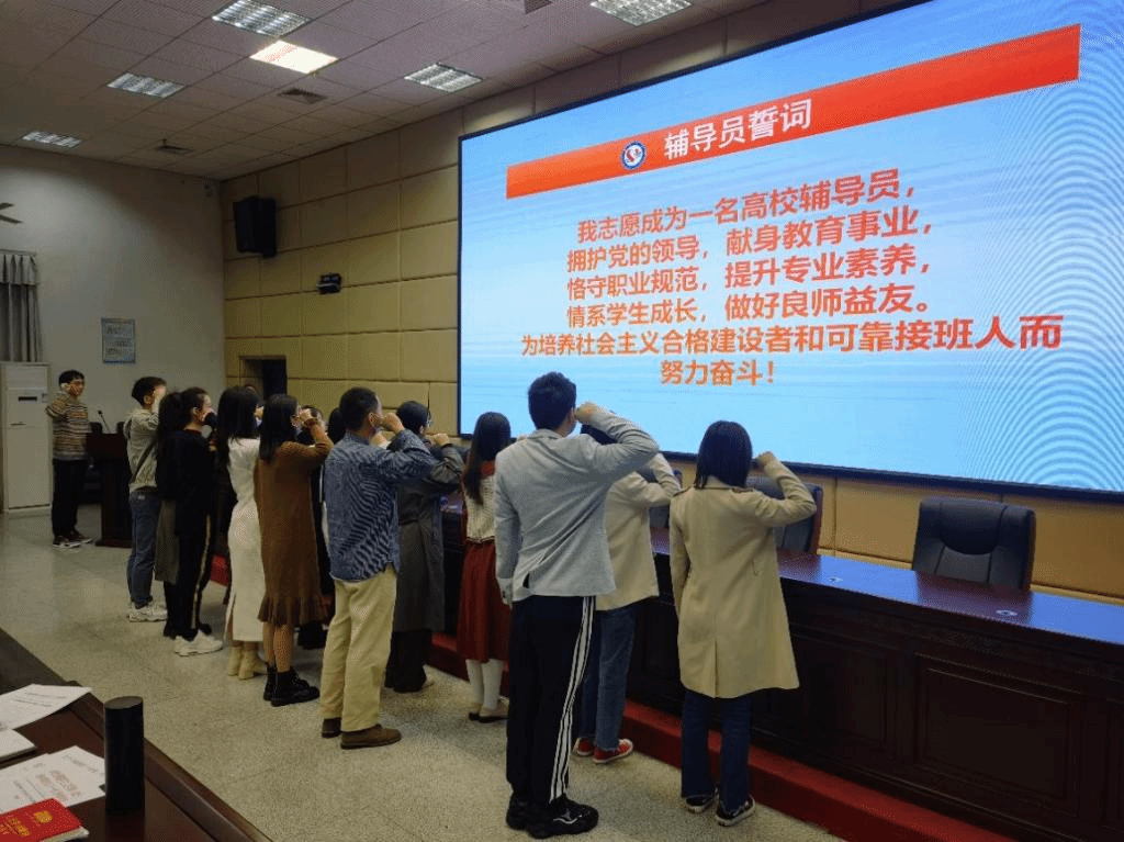 会上,今年新入职的18名辅导员先后做自我介绍,并在材环学院新进辅导员刘京宏博士的带领下,共同进行新进辅导员宣誓,表明了“为培养社会主义合格建设者和可靠接班人而努力奋斗!”的决心。