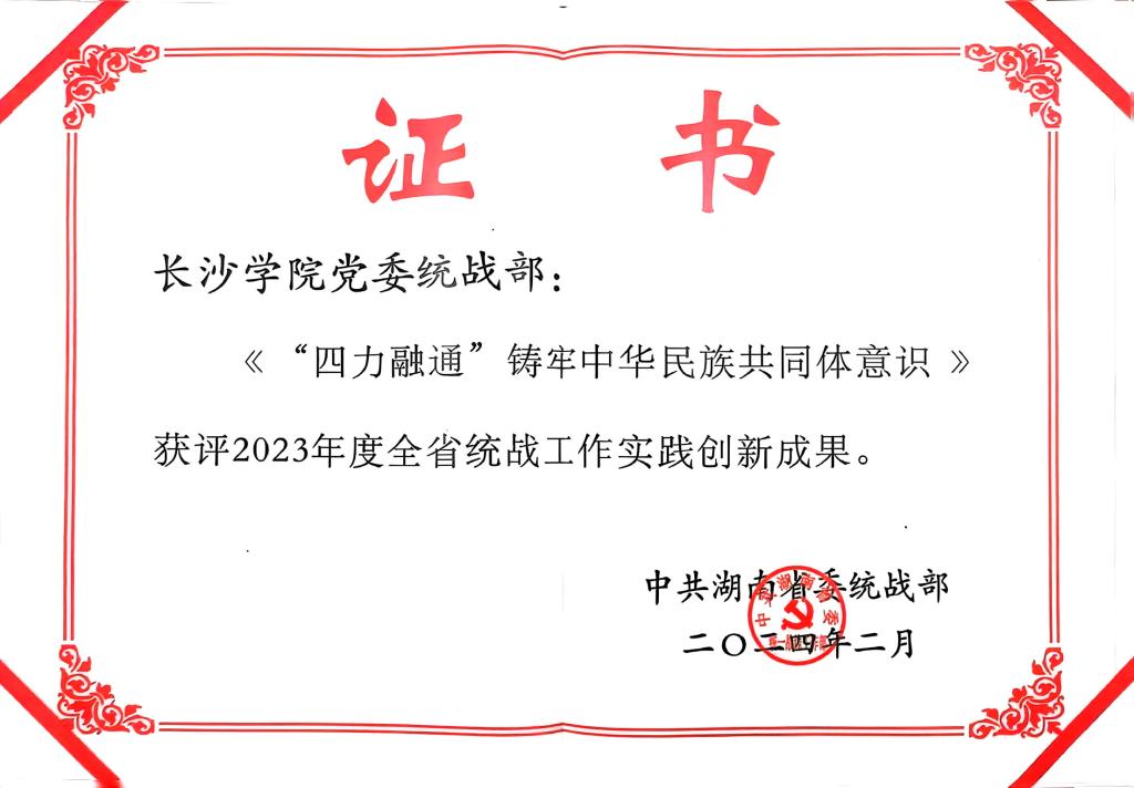 2月5日,全省统战部长会议在长沙召开。省委书记沈晓明作出批示,省委常委、省委统战部部长隋忠诚出席并讲话。会上,一批统战理论政策研究与实践创新先进集体和个人获得表彰。我校获评“2023年度全省统战理论政策研究工作先进单位”,我校《“四力通融”铸牢中华民族共同体意识》工作实践获评“2023年度全省统战工作实践创新成果”,生物与化学工程学院辅导员林涵的课题《新媒体时代高校防范宗教网络渗透的长效机制研究》获得“2023年度全省统战理论政策研究创新成果三等奖”。