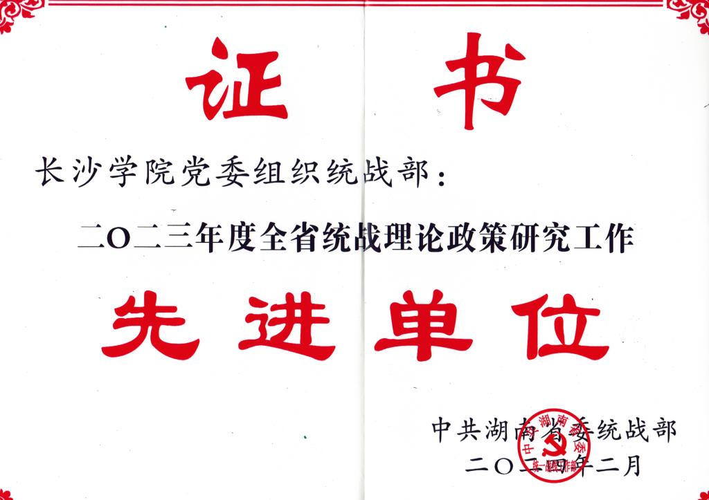 2023年,我校深入学习贯彻习近平总书记关于做好新时代党的统一战线工作的重要思想,守正创新推动统战工作纵深发展。学校“有组织”开展统战理论政策研究与实践创新,立项湖南省统战理论政策研究课题8项(重点课题1项,一般课题7项),高质量完成了湖南省委统战部组织的“中国新型政党制度理论研究基地”以及“全省2023年度统战工作实践创新成果”等申报工作。