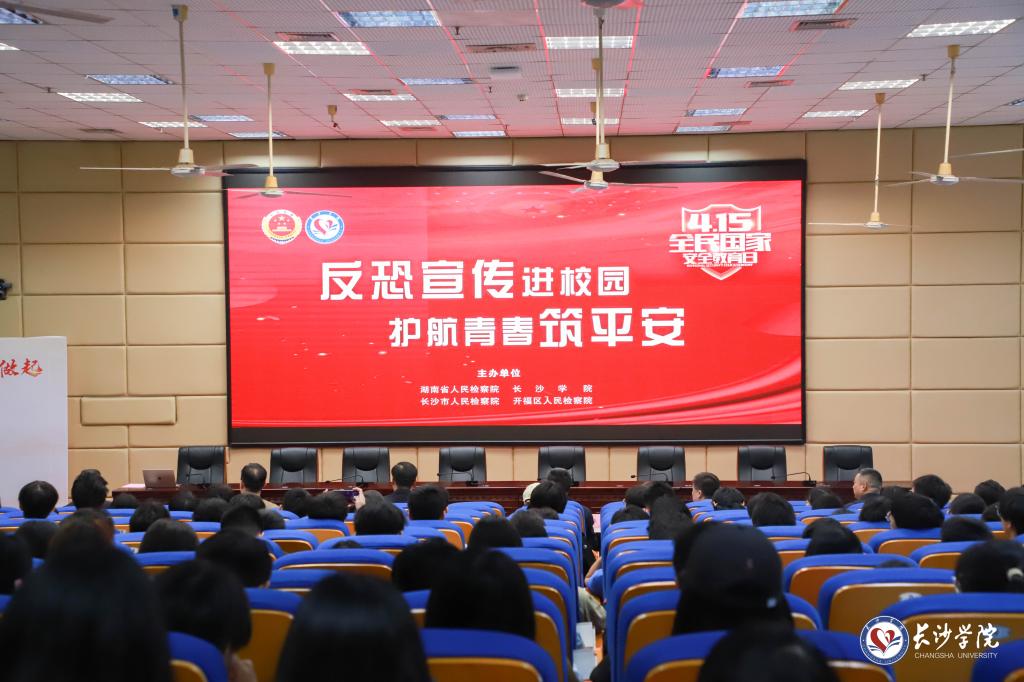 4月12日下午,在第9个“全民国家安全教育日”来临之际,为深入贯彻落实总体国家安全观,进一步增强全民反恐意识和应对能力,我校联合湖南省检察院、长沙市检察院、开福区检察院三级检察院在致远楼学术报告厅开展“反恐宣传进校园 护航青春筑平安”宣传教育活动,号召广大青年自觉践行总体国家安全观,增强防恐反恐意识,争做反恐卫士。学校300名师生代表参加活动。