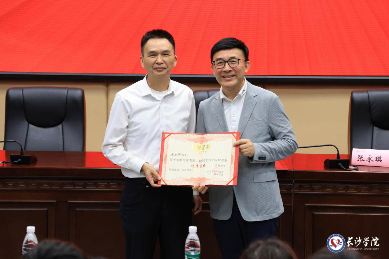(刘寒波为张永琪颁发客座教授聘书和优秀校友荣誉证书)