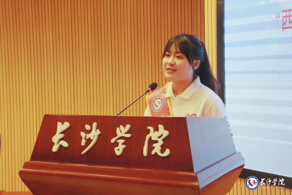 法学院2024届毕业生徐恒和外国语学院2024届毕业生唐森鸿代表志愿者发言。“我希望当回味我的青春时,曾经有一次为一份选择而奋不顾身。”徐恒在大学期间担任了法律志愿宣讲团成员,大学里的志愿服务经历使他更加坚定了成为西部计划志愿者的决心和信心;唐森鸿曾是学校国旗护卫队负责人,她用四分之三的大学时光守护国旗,今年更是在第一时间就报名参加西部计划志愿者的选拔,她说:“万水千山不忘来时路,如今我学有所成,能够到祖国最需要的地方,贡献力量,奋发有为,这是我对党和国家最好的感恩!”