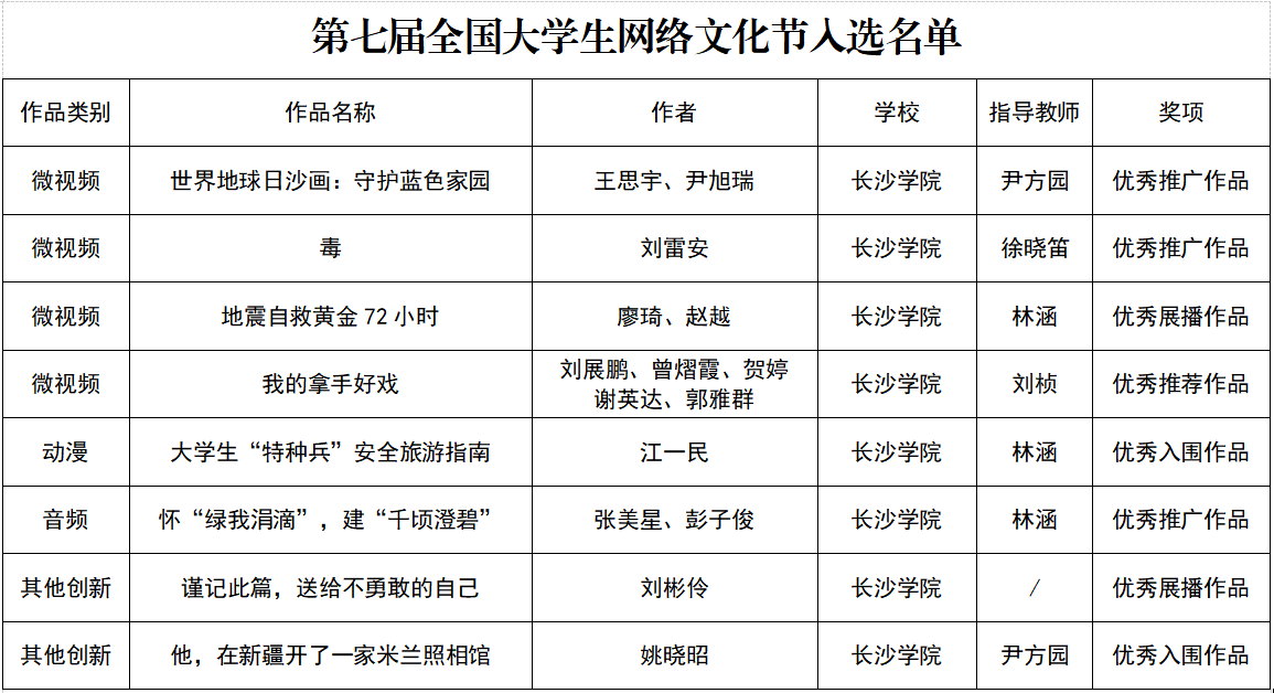 在全国大学生网络文化节中,我校选送的微视频《世界地球日沙画:守护蓝色家园》《毒》、音频《怀“绿我涓滴”,建“千顷澄碧”》获评优秀推广作品;微视频《地震自救黄金72小时》、其他创新作品《谨记此篇,送给不勇敢的自己》获评优秀展播作品;微视频《我的拿手好戏》获评优秀推荐作品;动漫《大学生“特种兵”安全旅游指南》、其他创新作品《他,在新疆开了一家米兰照相馆》获评优秀入围作品。在全国高校网络教育优秀作品推选展示活动中,我校辅导员谭敏捷、刘沁楚撰写的工作案例《聚焦“五度”工作理念,锻造“圈粉”思政品牌》获评优秀推荐作品。