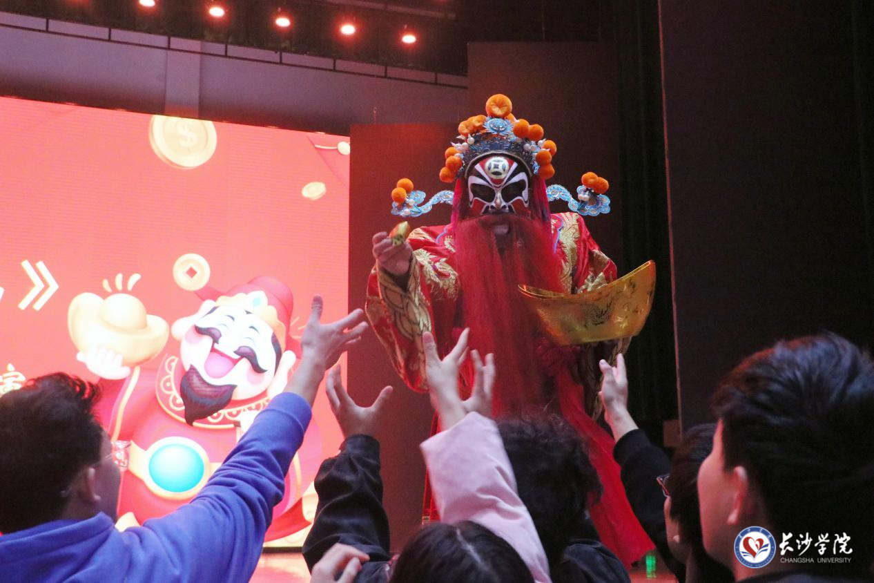 活动现场,湖南省京剧保护传承中心副团长葛倩倩向师生们介绍了京剧的四大行当,通过脸谱讲解与演员演绎相结合,生动展现了生、旦、净、丑四大行当的特点。在节目《变脸》中,演员与观众近距离接触,只见转身挥扇,新的脸谱便刹那间出现,引得现场掌声与欢呼声不断;一曲《迎春》,京胡、中阮等传统乐器交融合奏,余音绕梁,不绝于耳;在节目《财神赐福》中,演员通过演绎财神的动作、吐火的绝技将现场氛围点燃,并向观众送出了“元宝”;在节目《大闹天宫》中,演员以“猴戏”演绎的孙悟空机灵俏皮、洒脱不羁,更是通过与二郎神的武斗,淋漓尽致展现了武生的豪迈气势。