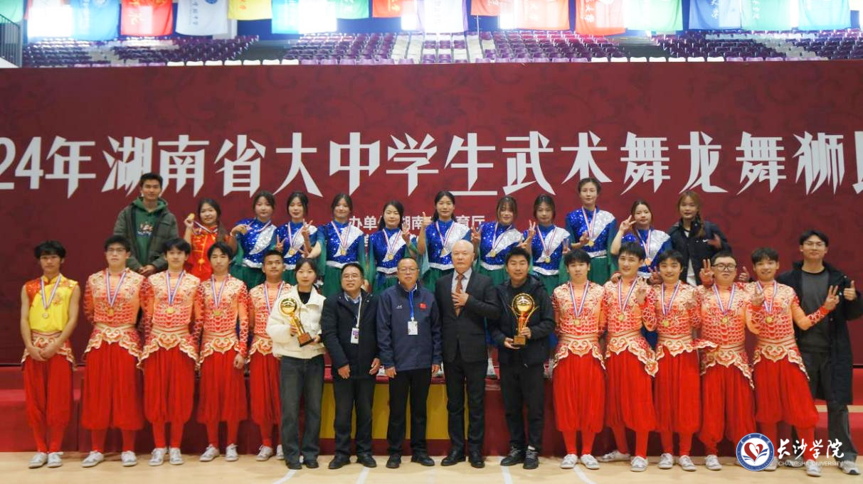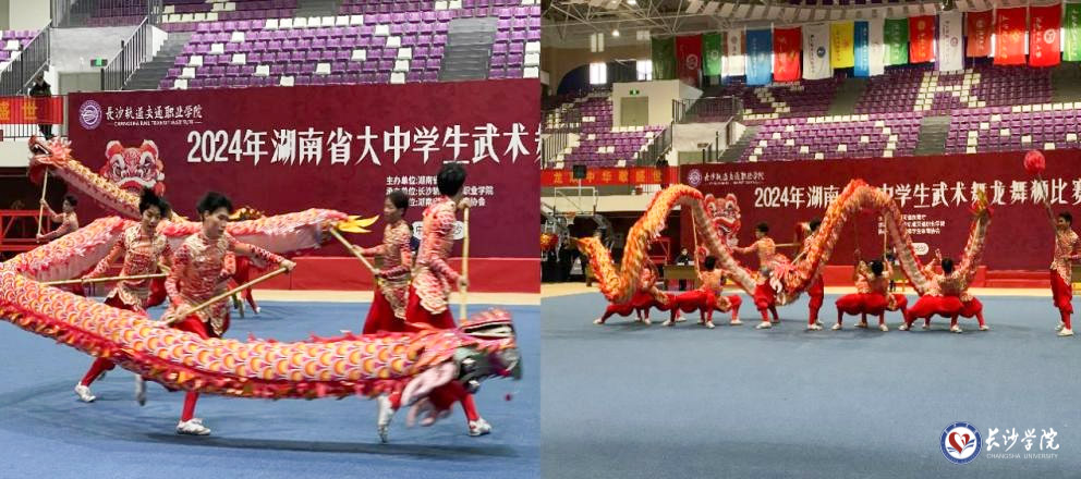 12月16日至23日,由湖南省教育厅主办的2024年湖南省大中学生武术和舞龙舞狮比赛在长沙轨道交通职业学院体育馆举行。来自全省76所大中学校,99支参赛队伍,1361名运动员齐聚一堂,共赴这场体育盛会。我校舞龙队24名运动员,在男子规定、女子规定、女子竞速项目中斩获2金1铜,并获得团体总分第六名;我校武术队8名运动员,在初级拳、初级棍、初级刀、初级枪、对练项目中斩获2金3银,并获得甲组团体总分第二名。