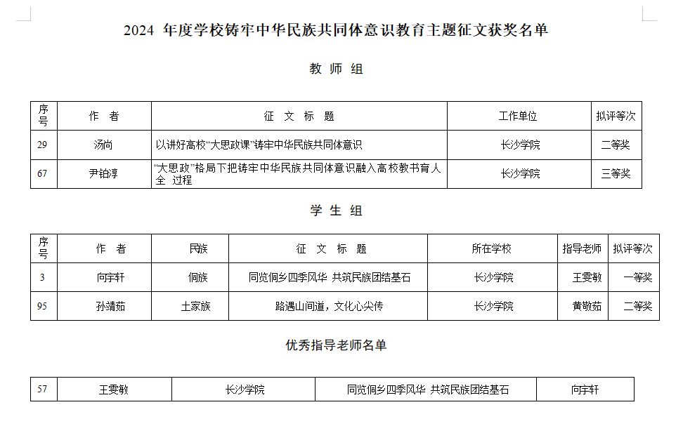 近日,湖南省教育厅下发了《关于公布2024年度湖南省学校铸牢中华民族共同体意识教育主题征文评奖结果的通知》,我校推荐报送的征文作品4篇获奖。其中,马栏山新媒体学院向宇轩的征文《同览侗乡四季风华 共筑民族团结基石》荣获学生组一等奖,经济与管理学院孙靖茹的征文《路遇山间道,文化心尖传》荣获学生组二等奖;图书馆馆员汤尚的征文《以讲好高校“大思政课”铸牢中华民族共同体意识》荣获教师组二等奖,外国语学院教师尹铂淳的征文《“大思政”格局下把铸牢中华民族共同体意识融入高校教书育人全过程》荣获教师组三等奖,马栏山新媒体学院辅导员王雯敏获评优秀指导老师。