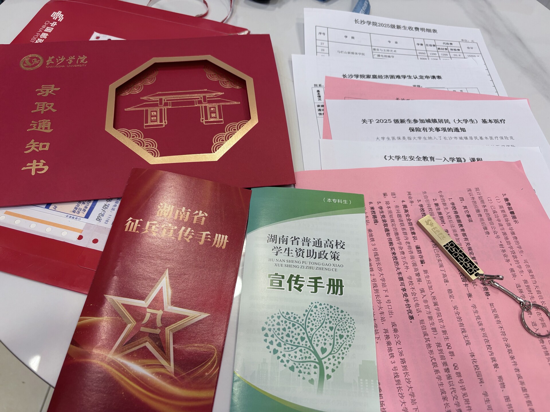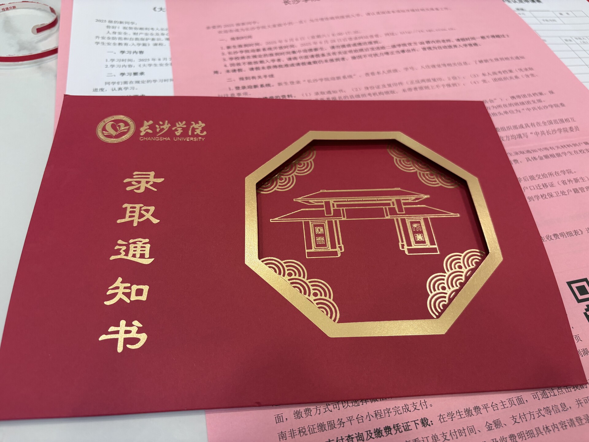 展开这份录取通知书,首先映入眼帘的是长沙学院的北大门,它静静地矗立在眼前。大门左侧,刻着“崇德求真,实干担当”的长大精神,这短短的几句话,承载着长沙学院深厚的文化底蕴。而通知书的背面,则印着“力学笃行”的长大校训,这四个字仿佛是学院对每一位学子的殷殷期望。长沙学院的通知书展现了校训与标志性建筑,传递着学院对未来学子的期许与文化底蕴。
