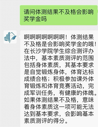 屏幕另一端,AI系统迅速检索知识库,3秒后回复:“体测结果不及格会影响奖学金的哦!在长沙学院学生综合素质评价办法中……”