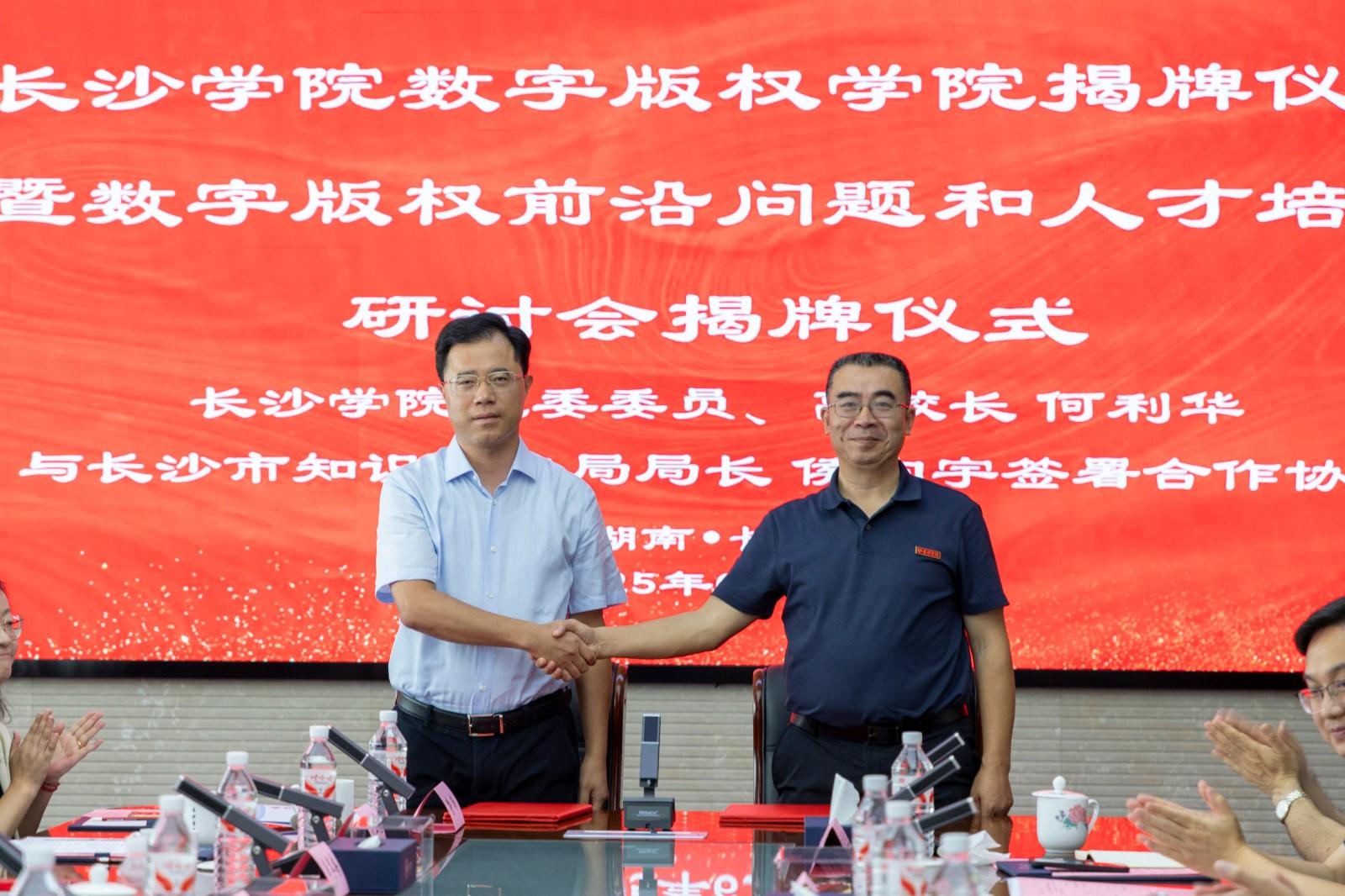 会上,长沙学院党委委员、副校长何利华宣读了学校成立数字版权学院的决定,并与全国人大监察和司法委员会委员、湖南省人大常委会原副主任谢勇教授共同为“长沙学院数字版权学院”揭牌。随后,何利华与长沙市知识产权局局长侯向宇签署了校政合作框架协议,将建立知识产权教学研究与实践深度融合的产学研一体化机制。