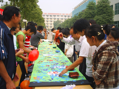感悟十七大,关注环保,热爱祖国。土木系07级工程管理二班制作了20张宣传环保图片,号召全校师生关爱家园,节约资源,抵制污染,植绿护绿,把环境保护工作提高到新水平。此外,他们还提出了五点具体的合理的环保建议:1、将练习本装订成草稿本。2、用包装纸做成手工艺品。3、尽量不用一次性碗筷。4、回收利用方便筷或竹签。5、多种植物。现场气氛热烈,很多同学在环保宣传横幅上留下了自己的手印,表达了支持环保,参与环保的决心。校党委副书记、副院长李云龙书记就"十七大的内涵"、"校园文化怎样来体现十七大精神"、"同学们如何来落实十七大"为现场同学作了近半个小时的讲演。