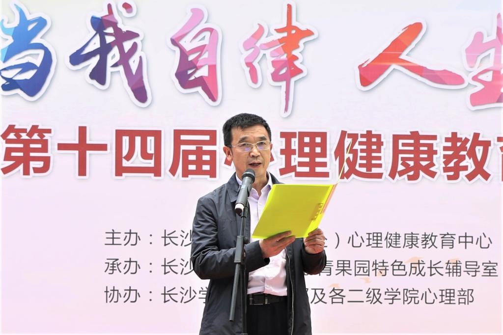 周明侠为活动致辞并宣布长沙学院第十四届大学生心理健康月活动正式启动。他表示,5月25日是全国大学生心理健康日,今年的“5·25”恰逢五四运动100周年,他鼓励广大青年同学们时刻践行自律精神,做好人生规划,脚踏实地,健康成长,感恩家庭,报效国家,服务社会。