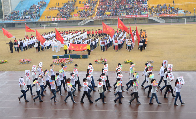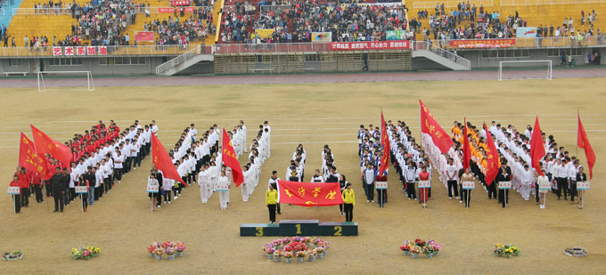 各系(院)代表队方阵、裁判员迈着铿锵有力的步伐,精神抖擞地依次通过主席台。其中工商管理系以独特的"工"字造型吸引了全场观众的视线,其"斗志昂扬、工管最强"的口号更是响彻云霄,充分显示出了他们青春的风采,别具一格的出场成为开幕式上一道绚丽的风景线。
