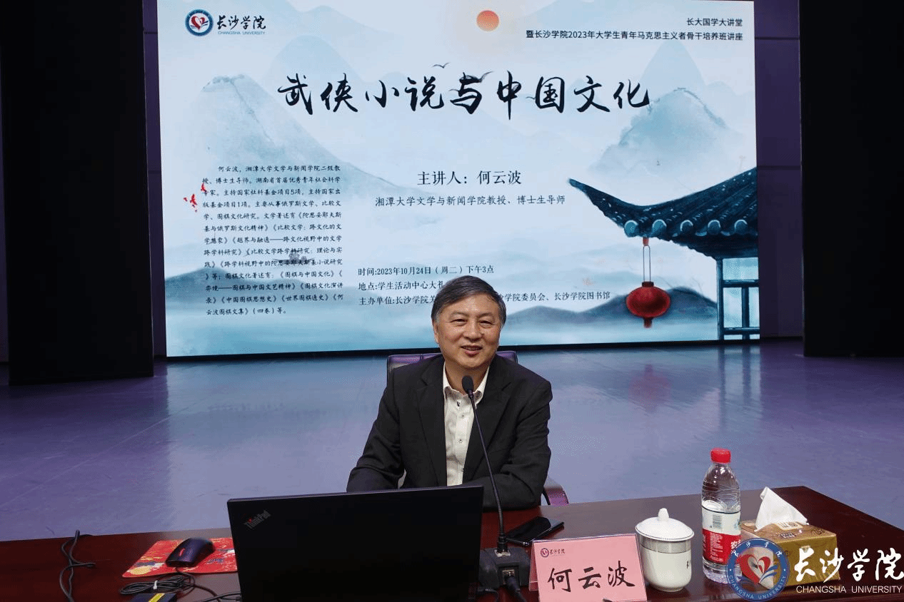 10月24日下午,由我校关工委、校团委、图书馆联合举办的长大国学大讲堂暨2023年大学生青年马克思主义骨干培训班主题讲座在学生活动中心大礼堂开讲。湘潭大学文学与新闻学院二级教授、博士生导师何云波为全校600余名师生带来了题为《武侠小说与中国文化》的精彩讲座。纪委书记丁文出席讲座。