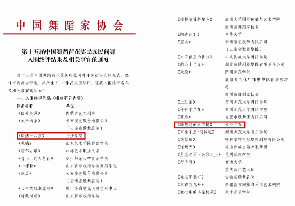 近日,中国舞蹈家协会正式发布第十五届中国舞蹈荷花奖民族民间舞终评结果,全国共有51部作品入围终评。我校音乐学院选送的两部原创作品《颤悠悠的板凳情》《锦绣十八洞》成功入围。