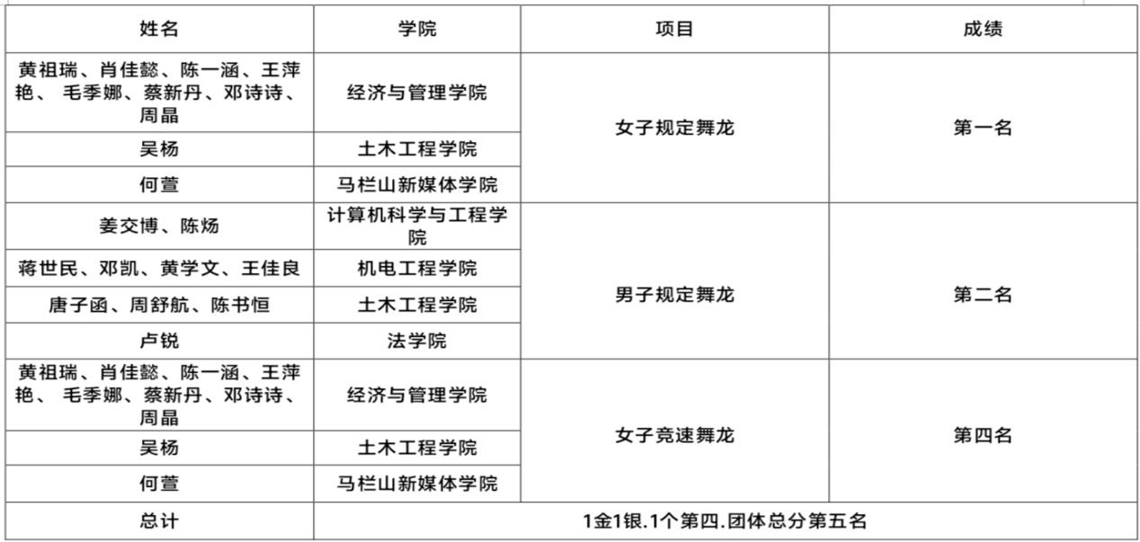 近日,由湖南省教育厅主办的2025年湖南省大学生舞龙舞狮比赛在张家界学院举行,吸引全省23支高校代表队、455名运动员参加。我校舞龙队在领队曾一兵,教练员熊玮、刘程程、刘毅军的带领下,奋勇拼搏,在女子规定、男子规定项目中斩获一金一银。