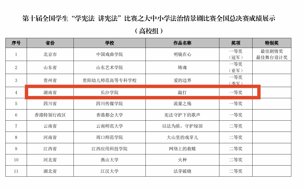 近日,由教育部主办、重庆市教育委员会承办、西南政法大学协办的第十届全国学生“学宪法 讲宪法”活动之大中小学法治情景剧全国总决赛在西南政法大学举行。我校原创法治情景剧《敲打》与来自34个省级行政区的44个优秀作品在全国总决赛的舞台上同台竞技,最终荣获一等奖。马栏山新媒体学院(影视艺术与文化传播学院)教师王若蘅获评“优秀指导教师”,全国仅六名高校教师获此殊荣。