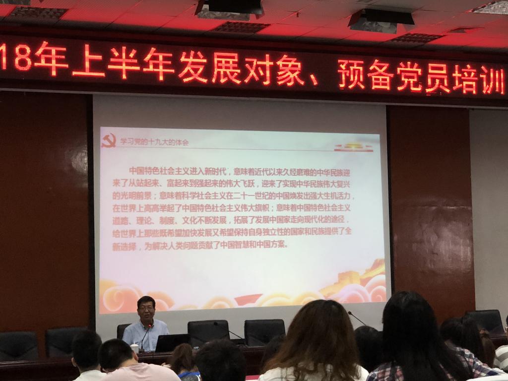 4月21日至22日,我校在致远楼学术报告厅举行2018年上半年党员发展对象和预备党员培训班。校党委书记韦成龙,湖南省社会科学院党组成员、副院长周小毛,湖南商学院党委副书记夏继春,校党委委员、纪委副书记兼纪检监察室主任甄洁洪分别为培训班学员授课,178名党员发展对象和160名预备党员参加培训。