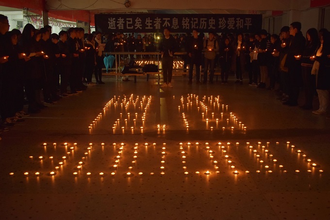 12月13日傍晚,由校团委主办的“逝者已矣,生者不息,铭记历史,珍爱和平”主题悼念活动在天健溜冰场举行。在庄严肃穆的气氛中,我校数百名团学干部面向由烛光组成的“南京·12.13·300000”,齐声高唱国歌,将哀思寄予国歌声中,让同学们铭记历史,勿忘国耻。学生代表刘紫林宣读祭文:“今天,一个东方的大国,用自己的体温,血泪和决心在办一场严肃的家事,以告慰逝者的在天之灵。……逝者已矣,生者不息。”每一句都铿锵有力,让人肃然起敬,激励着青年学生奋发图强,为中华崛起而读书,为实现中华民族伟大复兴而拼搏。