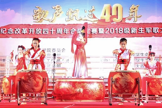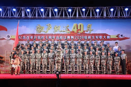 晚上七点,开场舞《盛世鼓舞》大气恢宏的鼓声奠定了整场比赛红色主题的基调。各学院选拔出的连队用饱满的精神、铿锵有力的军歌向军人致敬,向改革开放四十年致敬,向祖国母亲致敬。其中,计算机工程与应用数学学院三营二连弹起了他们心爱的“土琵琶”,古老悠扬的乐器弹出了保家卫国的刚强,柔美动人的歌声唱出了坚定不移的信念。经济与管理学院九营七连将一段段高难度的舞蹈与经典歌曲串烧相结合,描绘了改革开放四十周年来祖国翻天覆地的变化,表达了对新一个辉煌四十年的期待。艺术与设计学院十营一连在合唱中加入了豫剧元素,用质朴婉转的旋律演唱着党带领我们迎着光明,走向复兴的情景。