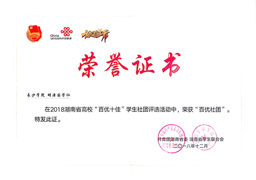 12月17日,由共青团湖南省委、湖南省学联共同主办的“社团王者”2018年度湖南省最受欢迎高校“百优十佳”学生社团网络推选活动颁奖典礼在湖南第一师范学院举行。经过网络投票和专家评审,最终我校学社联武术协会和明源国学社荣获全省“百优”社团。