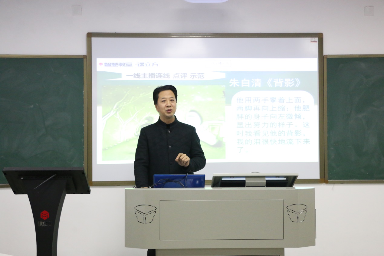 获得2018年全省普通高校教师信息化教学竞赛一等奖的荣斌老师充分发挥其双师型教师优势,以信息化手段主讲《广播电视节目播音主持》课中“动词描摹动态画面”这一知识点。课堂上,他以学生为主体,将微信、弹幕等信息化手段引入课堂,邀请听课学生、一线主播等连线朗读朱自清《背影》中的片段,形成多屏的即时互动,课堂生动有趣、引人入胜。