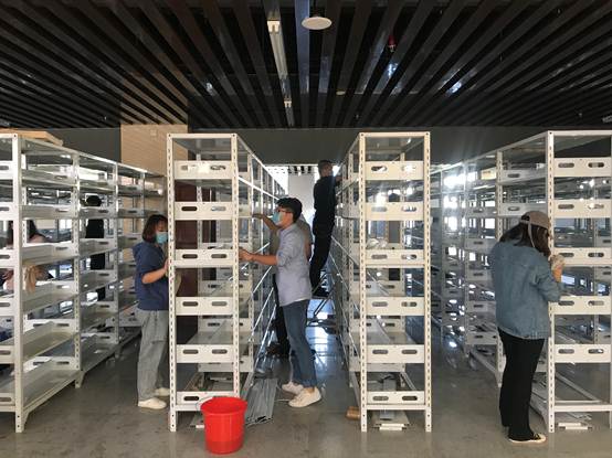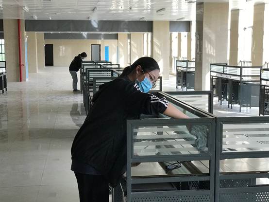 活动中,同学们五人一组,分工明确。大家不怕苦、不怕累,仔细擦拭着书架的每一个角落。
