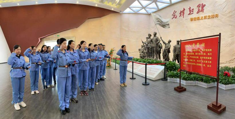 在秋收主义纪念馆前,师生党员们换上朴素的红军服装。音乐学院党总支书记陈滨滨同志带领在场的全体党员重温入党誓词。同志们举起右臂,仿佛又回到了当年入党宣誓的庄严时刻,心灵受到一次洗礼。