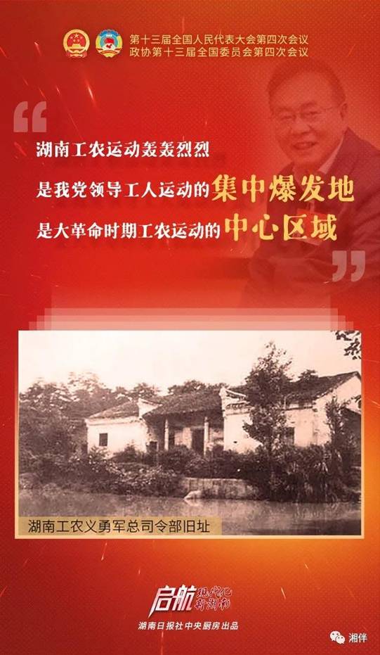 “湖南工农运动轰轰烈烈,是我党领导工农运动的集中爆发地之一,是大革命时期工农运动的中心区域。”陈晋介绍,共产党成立后,第一步是搞工人运动,紧接着搞农民运动。毛泽东是最早投身领导工人运动的共产党人之一,在湖南领导了10次工人罢工,还发动了安源路矿工人运动大获胜利。1925年毛泽东回韶山开展农民运动,在大革命高潮中,他从湖南农民运动当中看到了革命的经验,看到了革命的未来,他撰写的农民运动考察报告,成为马克思主义中国化很重要的一篇文章。