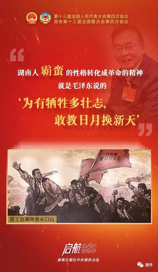 “湖南是中国共产党伟大精神的丰厚沃土,湖南人霸蛮的性格转化成革命的精神,就是毛主席说的‘为有牺牲多壮志,敢教日月换新天’。”