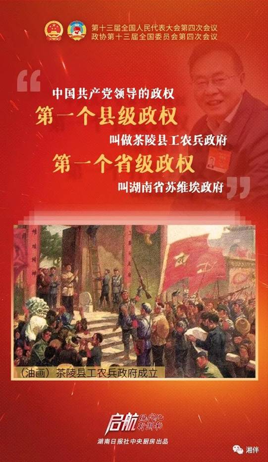 “湖南还是人民政权的建设地和诸多开创地之一。”陈晋说,中国共产党领导的政权,第一个县级政权叫做茶陵县工农兵政府,第一个省级政权叫湖南省苏维埃政府,都诞生在湖南。