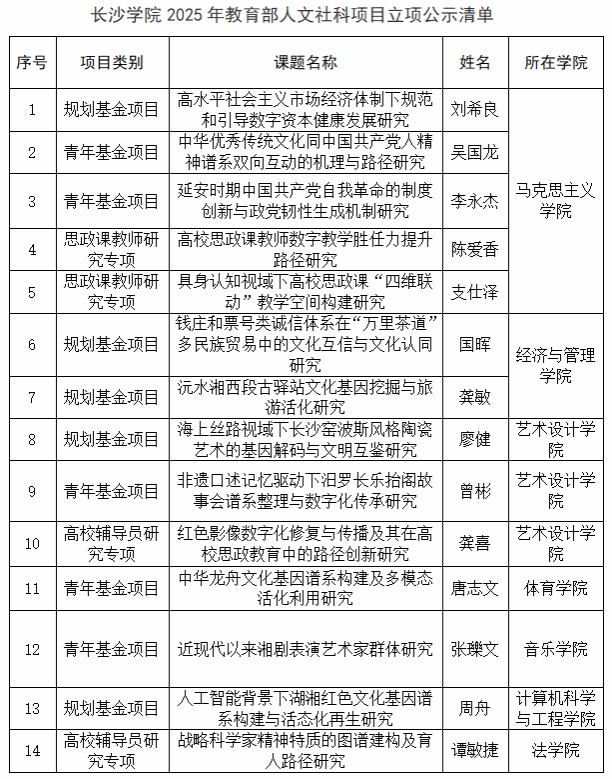 近日,教育部公示了2025年度人文社会科学研究一般项目和高校思想政治理论课教师研究专项的评审结果。我校共有14个项目获得立项公示,包括规划基金项目5项、青年基金项目5项、高校辅导员研究专项2项、高校思想政治理论课教师研究专项2项。