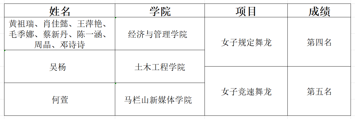 12月5日至10日,第十七届全国舞龙舞狮锦标赛在江苏常州举行。我校由10名非体育专业学生组成的女子舞龙队首次亮相全国舞台,与众多专业院校强队同台竞技,最终获得女子舞龙规定套路第四名、女子竞速舞龙第五名,全部队员凭借卓越表现,达到国家级运动员专项技术等级认定标准,晋升为“国家一级运动员”。